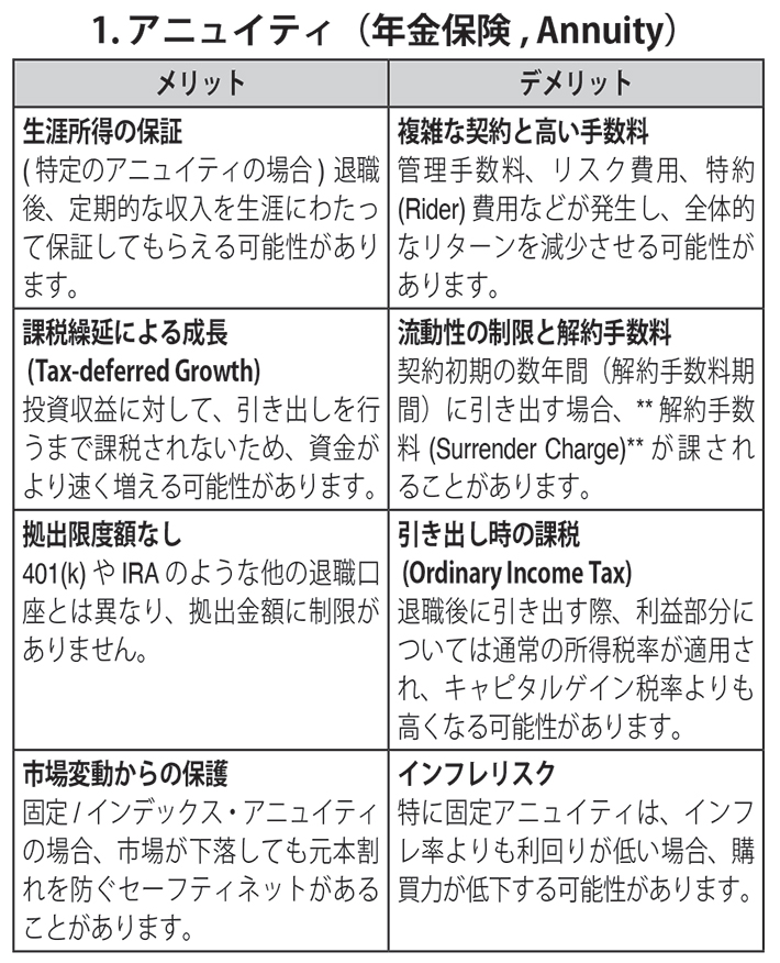 注記: “Traditional IRA、401(k)、Roth IRA: これらは、保険会社も取り扱うことができる一般的な退職口座であり、税制優遇が受けられます(例:Traditionalは税引前拠出・引き出し時課税、Rothは税引後拠出・引き出し時非課税)。