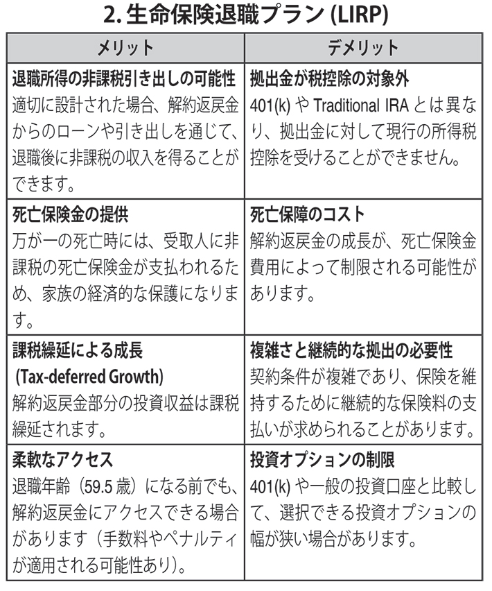 2、生命保険退職プラン (Life Insurance Retirement Plan, LIRP)