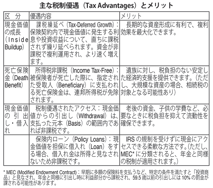 米国では、個人が支払う保険料(Premium)自体に直接的な所得控除(Tax Deduction)はありません。しかし、積立型の終身生命保険(Permanent Life Insurance、例:Whole Life、Universal Life)のように現金価値(Cash Value)が積み立てられる商品には、強力な税制優遇措置があります。