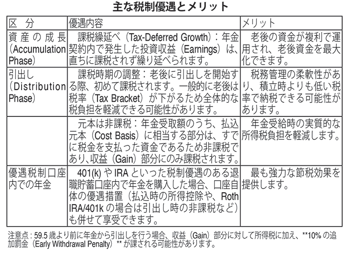 年金(Annuity)は老後の所得確保のために設計された商品で、生命保険と同様に、個人的な払込保険料に直接的な所得控除はありません。(例外:IRA/401(k)などの優遇税制口座内で年金を契約した場合)年金の主な税制優遇は、課税繰延べ(Tax Deferral)と老後所得の確保です。