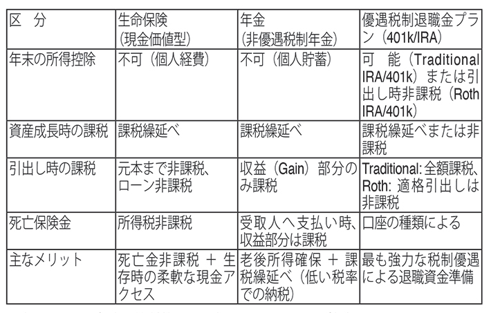 米国において年末に節税効果を最大化するには、所得控除(Tax Deduction)の恩恵がある 401(k) や IRAといった退職貯蓄口座に最大限拠出することが最優先です。生命保険や年金(Annuity)は、これらの口座の上限を超える資産を課税繰延べで管理し、流動性や保障を確保するための補完的な役割を果たします。